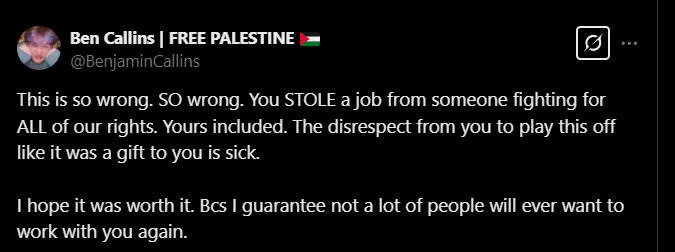Benjamin Callins meanwhile, a they/them activist whose only claim to fame is Netflix’s The Dragon Prince, went full meltdown mode on Twitter, ranting, “This is so wrong. SO wrong. You STOLE a job from someone fighting for ALL of our rights. Yours included. The disrespect from you to play this off like it was a gift to you is sick.”