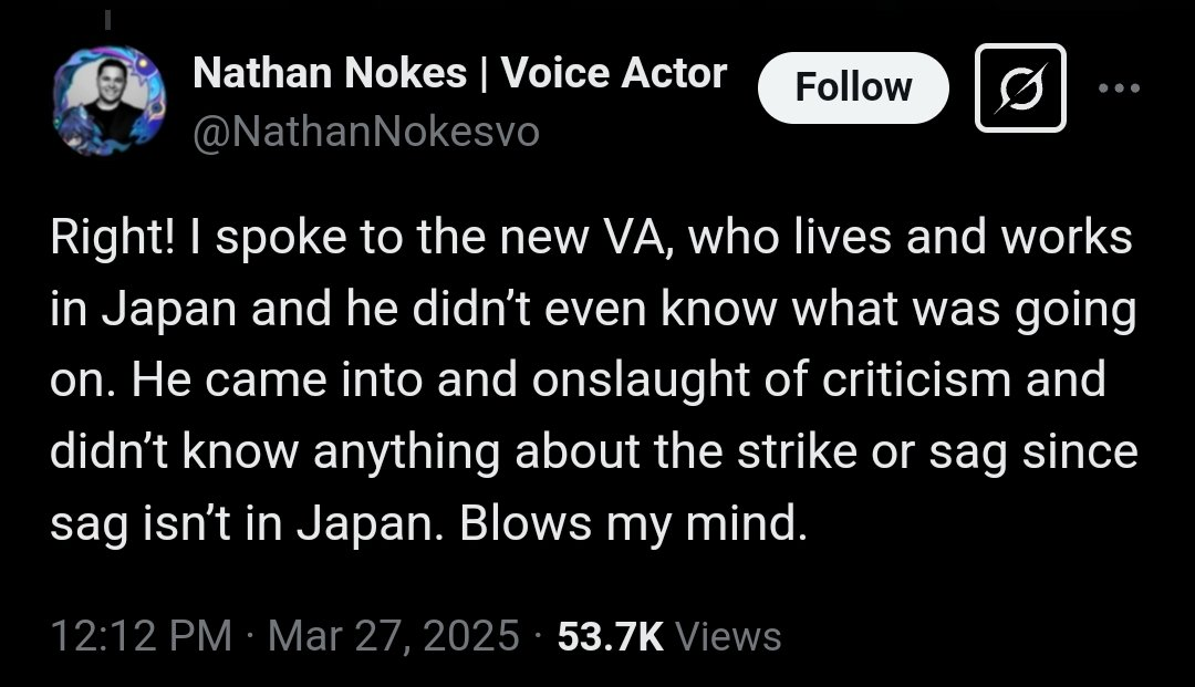 The recent outrage surrounding Jacob Takanashi only highlights something that has been clear for years: the Western voice acting industry is less concerned with improving working conditions and more focused on using their influence to bully companies into submission. Their priority isn’t fair treatment but control.
