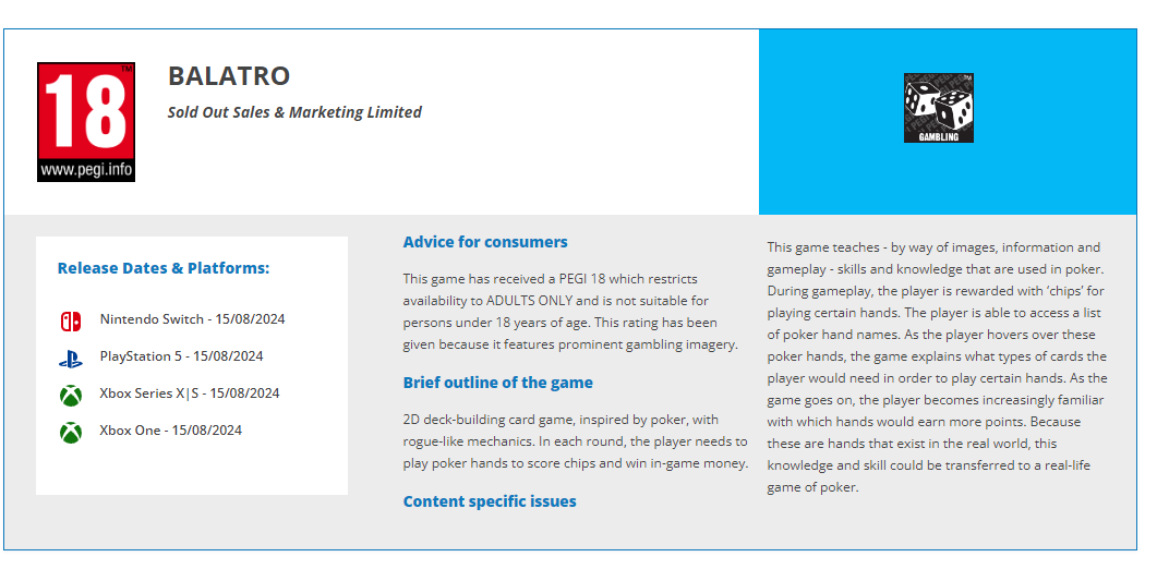 The shift from an initial 3+ rating, essentially making the game accessible to everyone to a far more restrictive 18+ rating represents a significant clampdown. PEGI’s revised classification not only limits Balatro’s potential audience in Europe but also directly impacts its sales prospects.