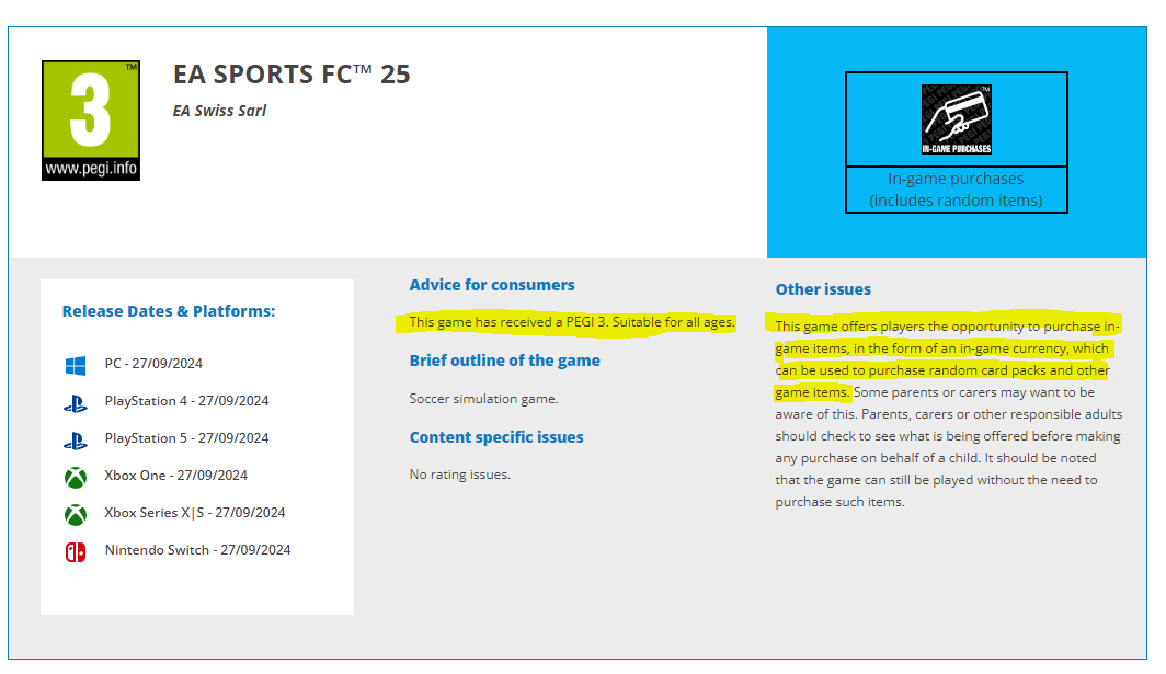 Yet, they openly allow consumers to spend real money on player packs for fantasy rosters. Past releases like NBA 2K20 by 2K Games and Visual Concepts also received a 3+ age rating, despite widespread criticism for incorporating similar “MyTeam” microtransaction systems as EA’s sports titles.