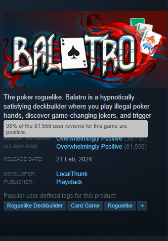 Even more remarkable, Balatro boasts a 98% user rating on Steam with over 81,556 reviews, signaling its massive popularity. And here I am, an indie game advocate, somehow completely oblivious to its existence until a month ago. Just like with journalism it’s evident that I’m also shit at this too.