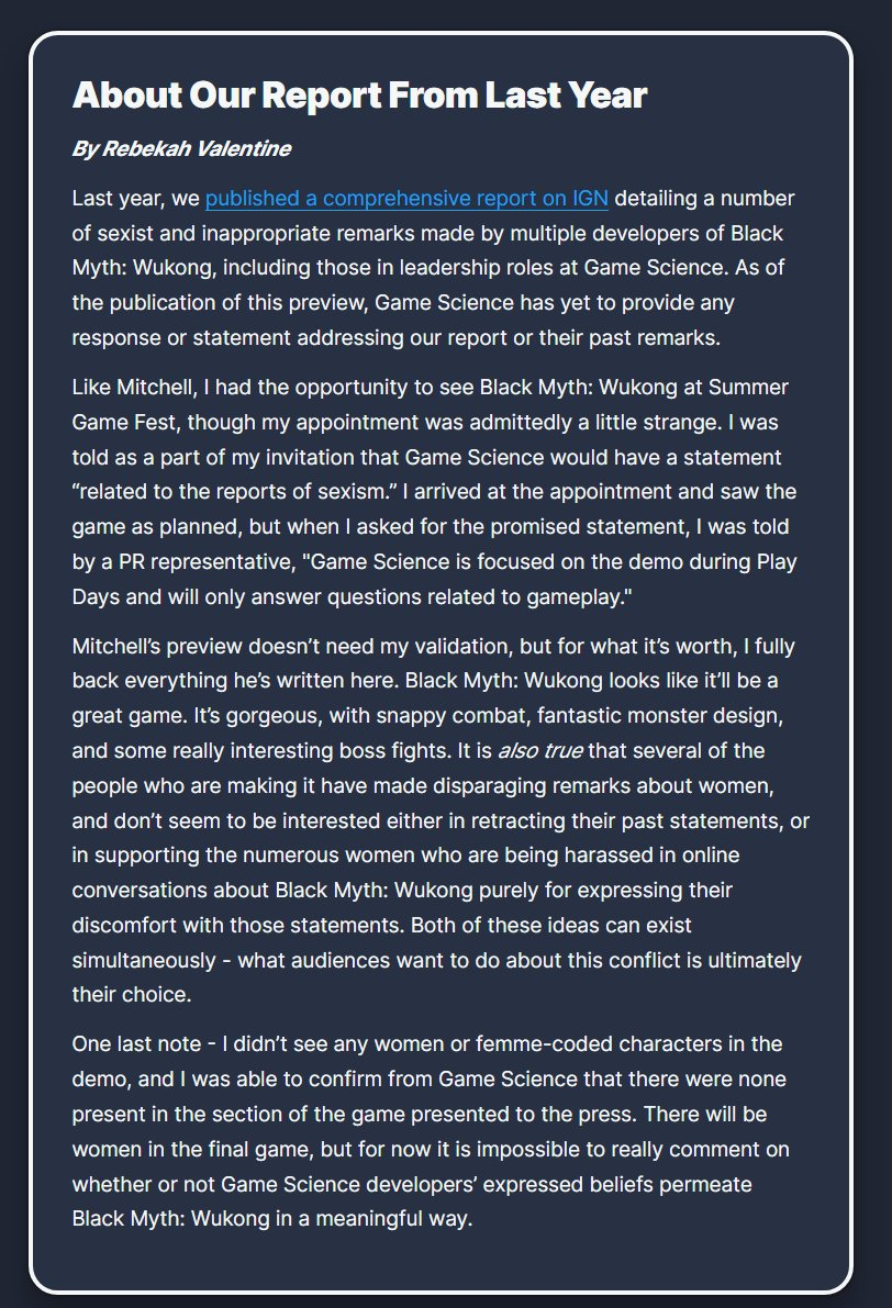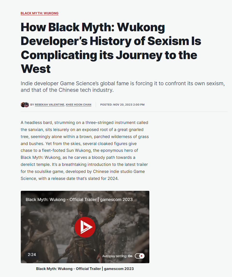 Each article adds more defamatory statements, based on IGN’s “own research,” which consists of mistranslated interpretations. They also demand that the developers at Game Science address these false allegations, while complaining about the lack of female characters in the game’s presentation footage.