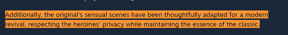 As stated on the Steam store page for STEAM-HEART’S Saturn Tribute, the “sensual scenes have been thoughtfully adapted for a modern revival, respecting the heroines’ privacy while maintaining the essence of the classic” which is just a fancy way of saying there’s no nudity present.