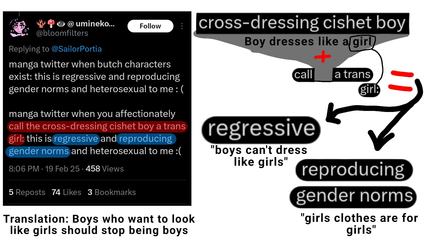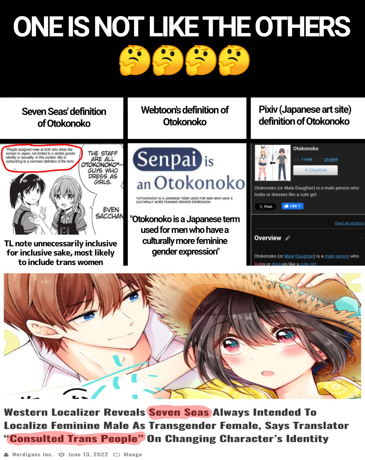 The appropriation of traps, femboys / otokonoko characters has become increasingly common in recent years, driven by performative activists and individuals seeking “validation” and “equal rights.” However, rather than creating original representation, they instead seek to impose their ideology onto existing works, altering well-established characters to fit their identity instead.