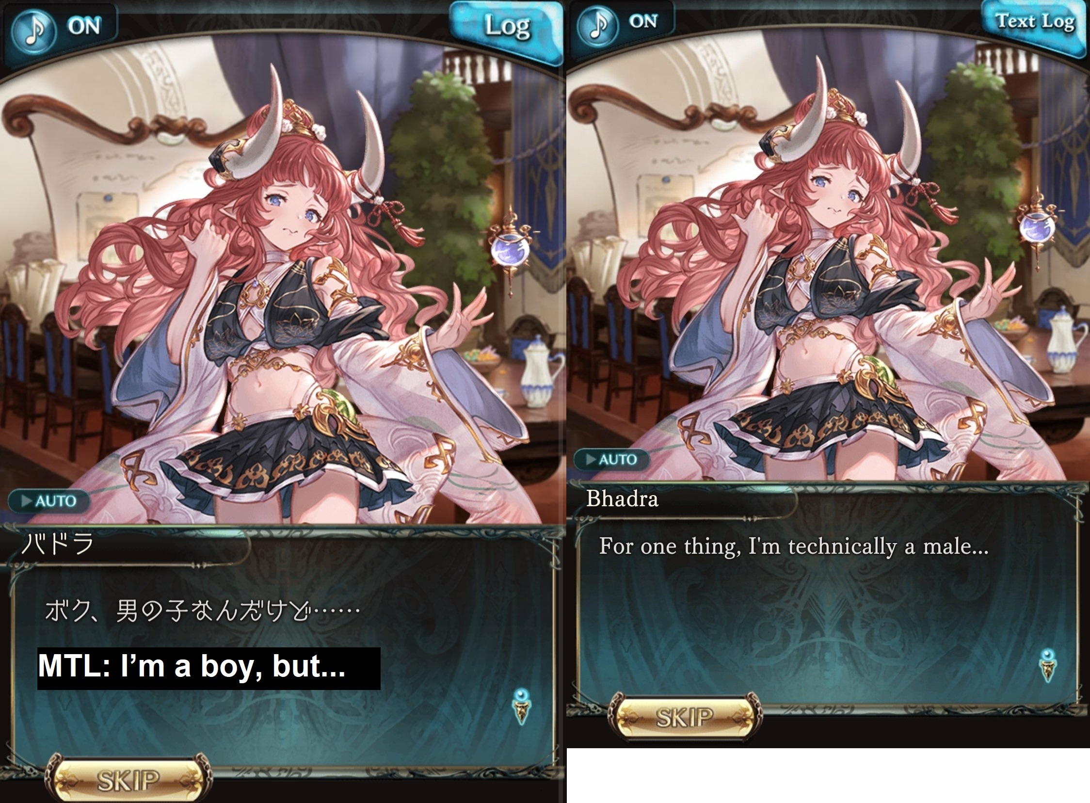 By subtly restructuring sentences and introducing additional wording, the English localization of Granblue Fantasy creates an implication that Bhadra is transgender, an interpretation absent from the original Japanese text. This practice distorts the original intent of the character while simultaneously erasing a well-established cultural archetype, replacing it with a Western framework that prioritizes ideological representation over faithfulness to the source material.