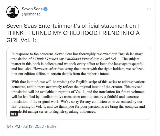 Even Japan’s thriving manga industry isn’t safe from Western attempts to appropriate and erase its cultural archetypes. A glaring example of this is the English localization of I Think I Turned My Childhood Friend Into a Girl by Seven Seas. Rather than faithfully translating the work, the localizers deliberately rewrote the story’s core identity, transforming a boys’ love narrative into a transgender romance.