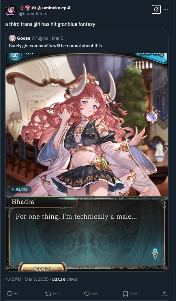 In Granblue Fantasy’s case, altering Bhadra’s identity risks alienating the core fanbase that values the game’s diverse cast, its otokonoko representation, which is a key part of its appeal. Meanwhile, a vocal minority of transgender activists eagerly impose their identity onto existing fans, emboldened by Cygames America’s appropriation of its Japanese roots.