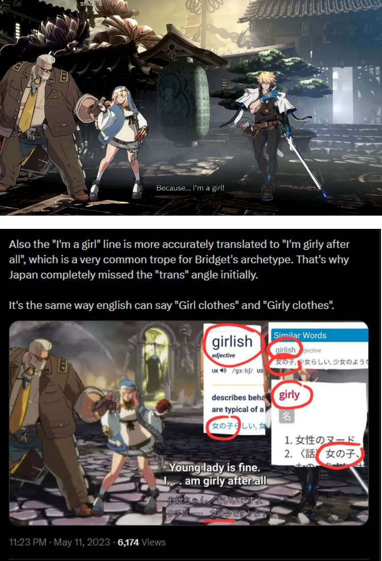 A prime example of this is the never-ending Guilty Gear discourse surrounding Bridget. His design as an effluent male is quintessentially otokonoko, his lore and backstory complements his design as Bridget is a boy raised as a girl due to his village’s superstition about twin boys bringing destruction. Bridget was unfortunately co-opted in the English localization of Guilty Gear -Strive- to facilitate a transgender narrative, completely reinterpreting the character’s established lore and identity spanning back decades.