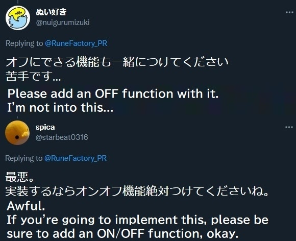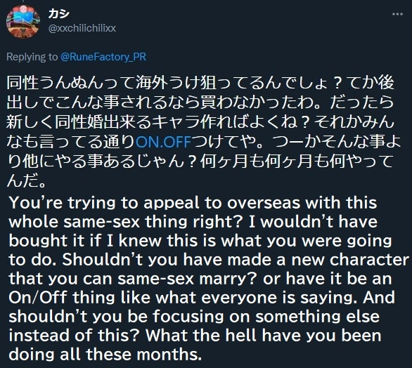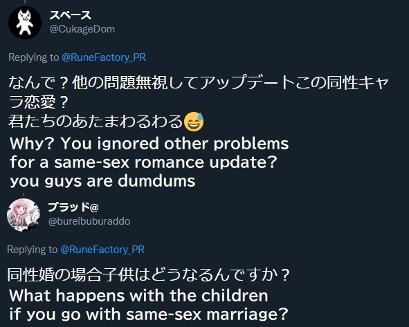 The inclusion of same-sex marriage options upset the core Japanese audience of the franchise, who took to Twitter to express their frustrations as to why Marvelous and XSEED would prioritize homosexual relationships over actual bug fixes.