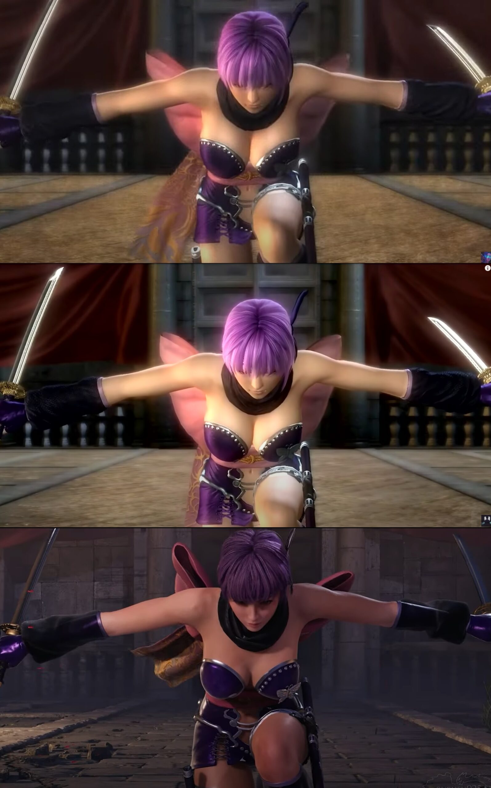 This likely explains the visual differences between the original and the remake, as Ayane’s in-game model no longer features the exaggerated design seen in the FMVs of older games. FMVs were traditionally pre-rendered with higher-quality assets and more detailed models than what real-time gameplay could achieve, allowing for enhanced fidelity in textures, lighting, and animations.