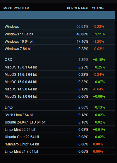 According to Steam’s hardware survey, Windows 11 now leads as the most-used operating system at 48.8%, followed closely by Windows 10 at 47.46%. However, Windows 10 is expected to decline rapidly over the years as hardware compatibility erodes with future CPU and GPU generations, just as Valve ended support for Windows 7.