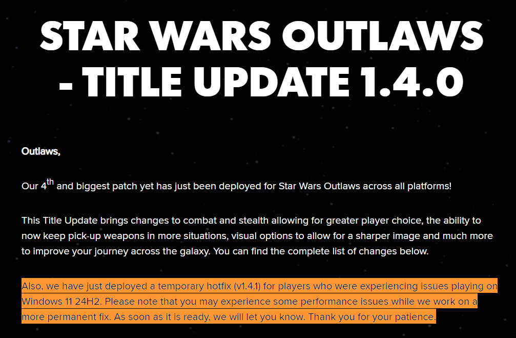 Ubisoft has released a temporary workaround for Star Wars Outlaws to assist players who have already installed the problematic Windows 11 update. However, the company acknowledges that this fix is not foolproof, and issues will persist until Microsoft delivers a proper solution.