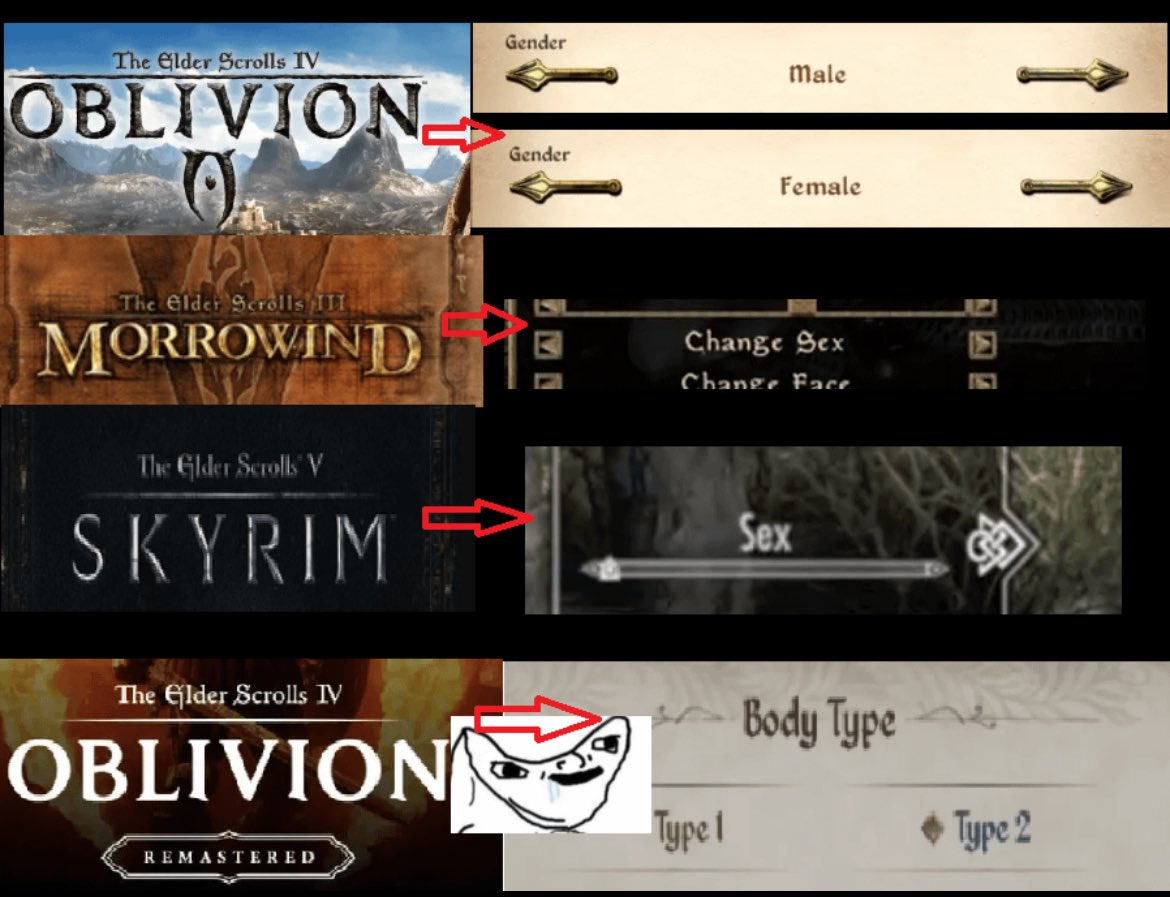 This ongoing double standard reached a boiling point with the abrupt release The Elder Scrolls IV: Oblivion Remastered which had replaced its classic “male” and “female” descriptors during the character creation with “Body Type 1” (female default) and “Body Type 2” (male), aligning with modern day gender ideology while stripping the game of its original context.