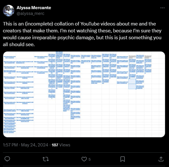 Since then, not much has happened, but there have been new developments. Alyssa Mercante has created her own list, featuring numerous YouTubers who have made videos about her.