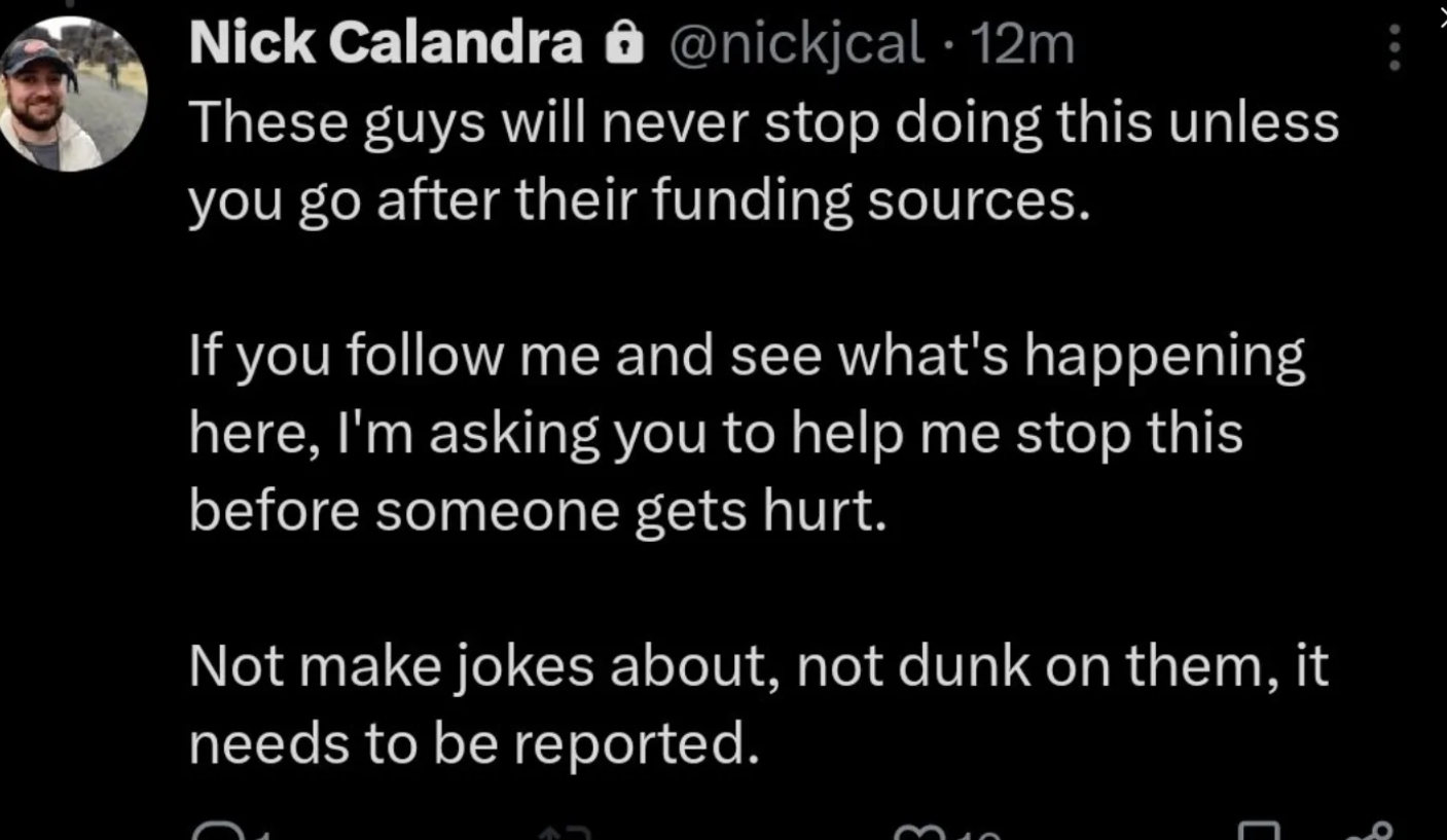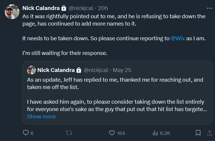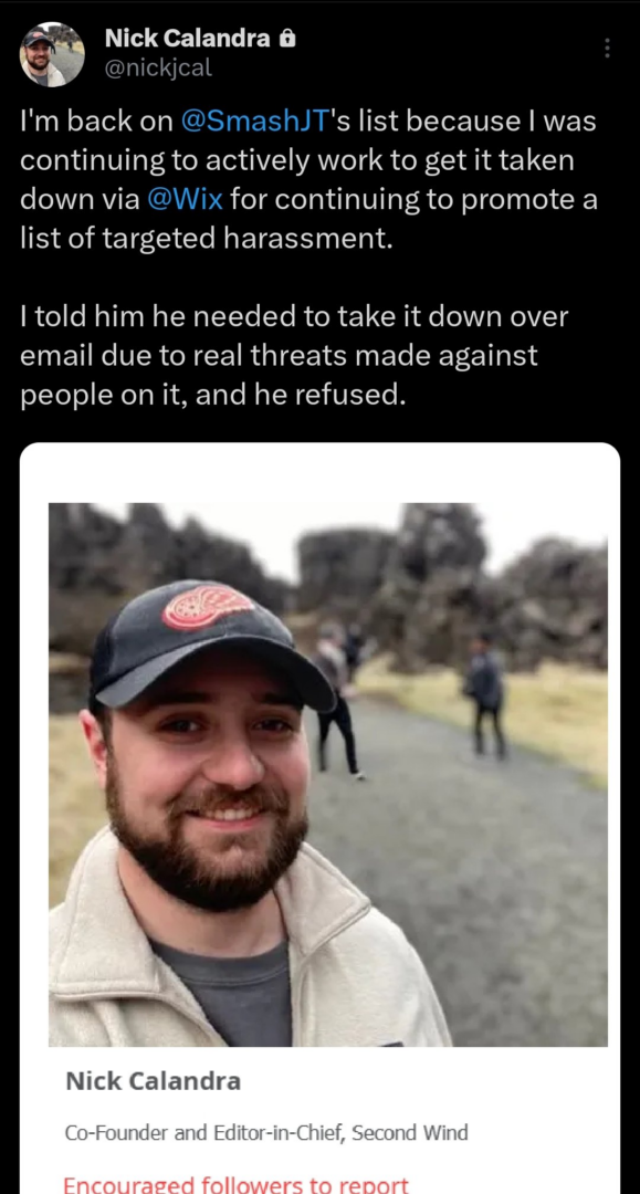 Nick Calandra entered the fray by encouraging individuals on Twitter to report Smash JT’s website to Wix. Using his locked/protected account, he organized his followers to target Smash JT’s site simply because it featured a comprehensive list of publicly available information, including details about himself.