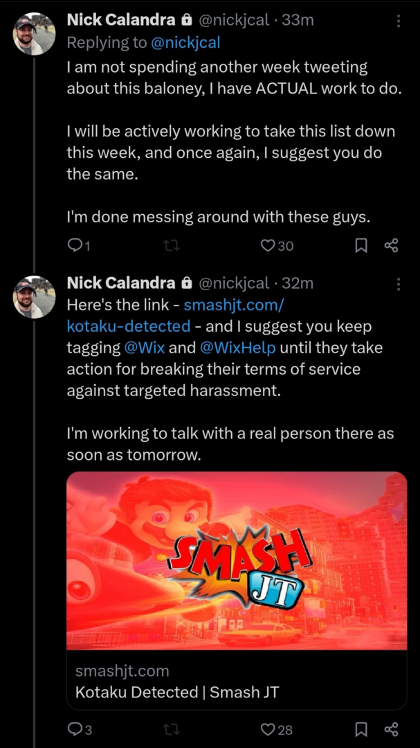 Smash JT announced that his website was disabled by Wix due to “privacy violations,” which is ironic given that the “Kotaku Detected” list contained only publicly available information about the journalists in question.