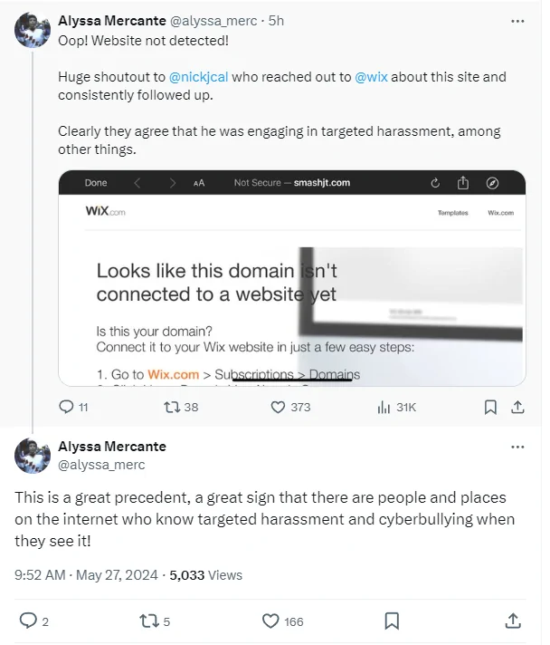 Alyssa Mercante took the opportunity to gloat about the temporary takedown of Smash JT’s website, sharing a tweet featuring his defunct homepage with the caption “Website Not Detected.”