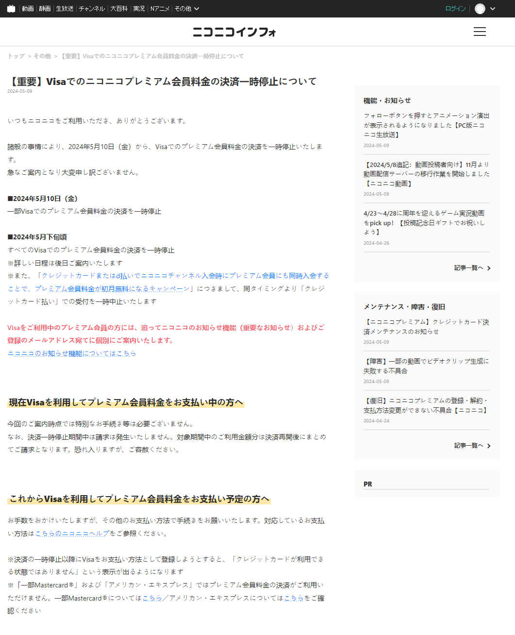 Now, seemingly out of the blue, Niconico has announced that “due to various circumstances,” VISA is no longer a viable option for those interested in subscribing to Niconico Premium.