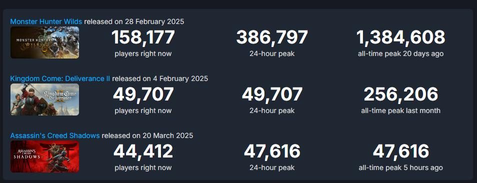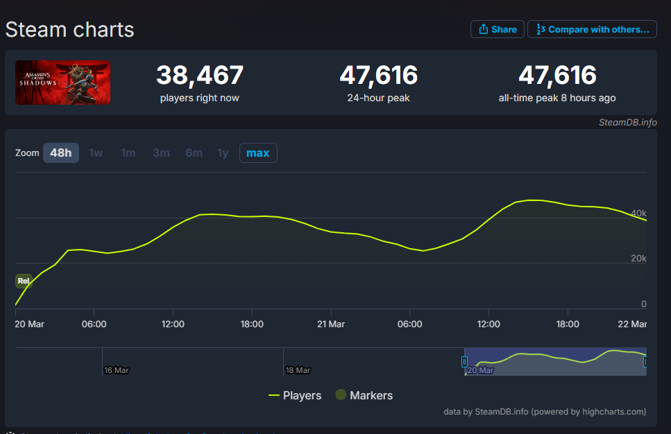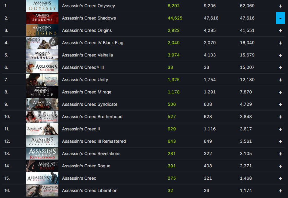 To put its figure of 47,600 concurrent players into perspective, Assassin’s Creed Shadows has only slightly surpassed the peak of Assassin’s Creed Origins (41,551) from 2017, while significantly trailing behind Assassin’s Creed Odyssey (62,069) from 2018.