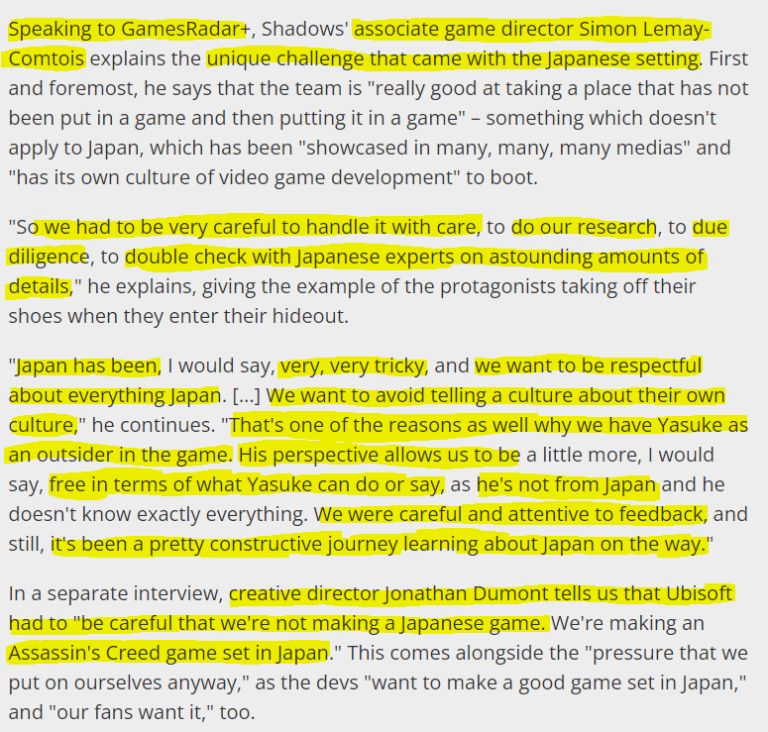 Now, the standard for praise appears to be less about gameplay or authenticity and more about celebrating Shadows simply because it marks the franchise’s first setting in Asia, although it doesn’t actually feature a real Asian protagonist.
