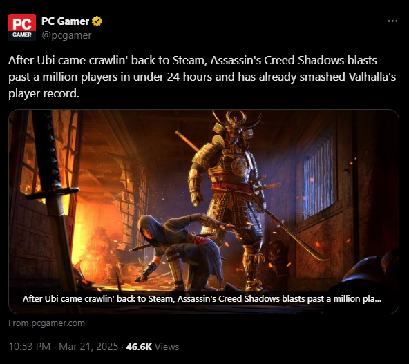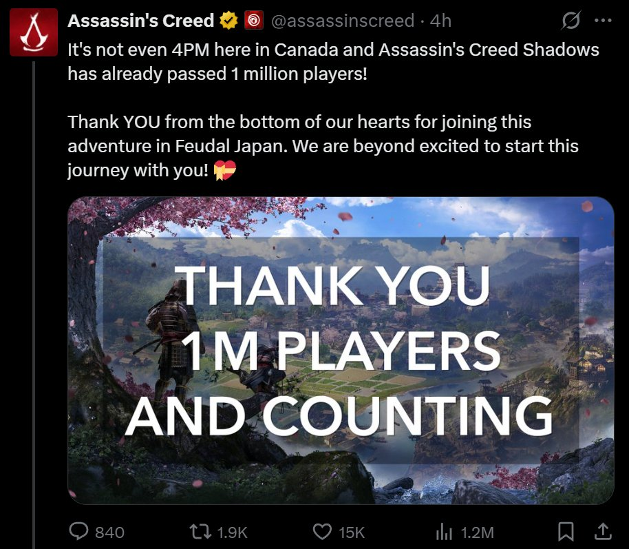 In what appears to be a strategic attempt to generate positive publicity for their release, Ubisoft has claimed that Assassin’s Creed Shadows has reached one million players across all platforms. This announcement is being widely celebrated by access media outlets.