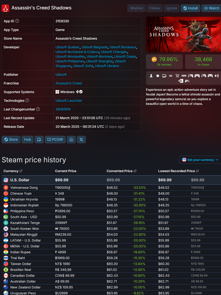 And it’s not like PC players make up a tiny portion of the audience. Even assuming PC accounts for just 20% of the player base and consoles take the remaining 80%, that would mean Assassin’s Creed Shadows has only sold about 450,000 copies in total. At a $70 price point, that’s roughly $31.5 million in revenue before even factoring in platform fees like platform fees.
