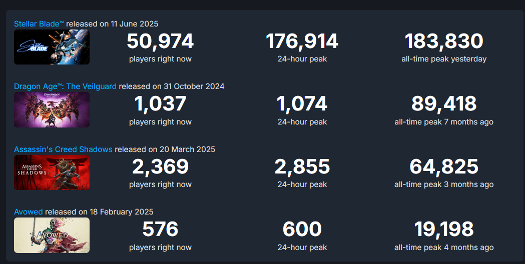 The game underperformed significantly, peaking at just 47,616 concurrent players on Steam. Ubisoft was forced to rely on Ubisoft+ subscribers to inflate engagement metrics. Meanwhile, EA’s long-awaited Dragon Age: The Veilguard, nearly a decade in the making, peaked at only 89,418 concurrent players.