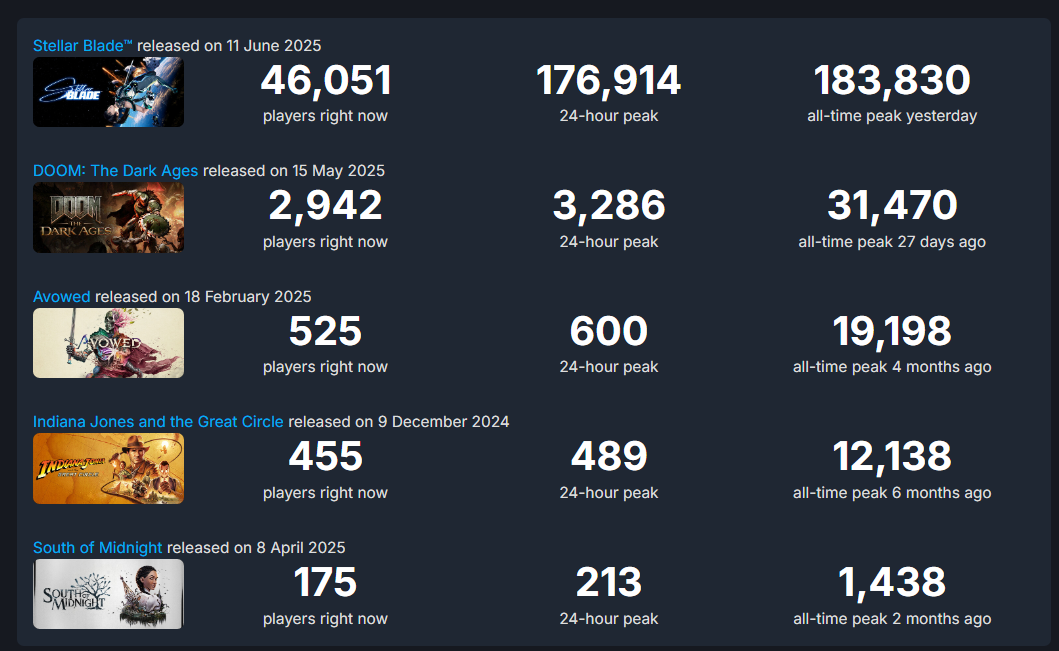 Released on June 11th, SHIFT UP’s Stellar Blade peaked at an astonishing 183,830 concurrent players on Steam making it the most successful PlayStation-published single-player game on PC to date.