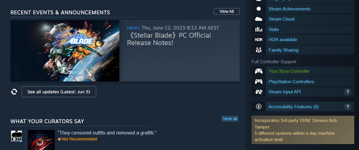 The PC release added further controversy, marking the first PlayStation port to include Denuvo, a cancerous DRM known for reducing system performance. Yet despite these setbacks, Stellar Blade’s reception has remained overwhelmingly positive, with players prioritizing its gameplay and core appeal over the missteps.