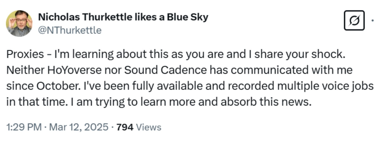 The contradiction between Thurkettle’s initial claims of being unaware of the recast and his later declaration of a deliberate boycott has led to accusations of gaslighting, portraying himself as a victim while retroactively framing his replacement as a principled stand against AI as he deliberately turned down the offer to reprise his role in Zenless Zone Zero.