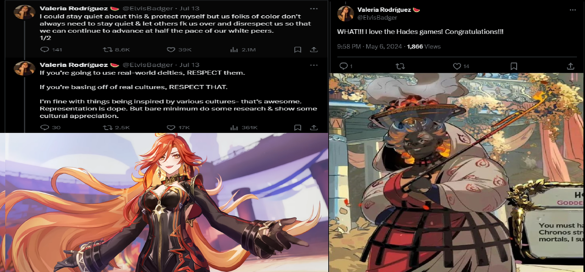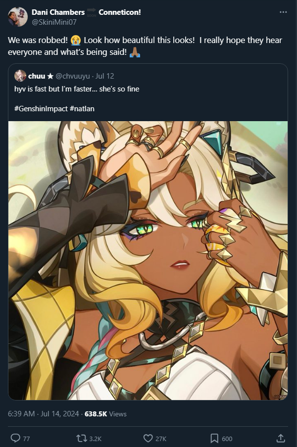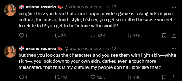 Leading the charge were Valeria Rodriguez, the queer non-binary voice of Sucrose; Ariana Rosario, a bisexual Dominican-American voicing background NPCs; and Dani Chambers, the voice of Nilou. All three eagerly amplified “fixed it” blackwashed fan edits and called for HoYoverse to show “proper respect” to the real world cultures their fictional fantasy game supposedly draws from.