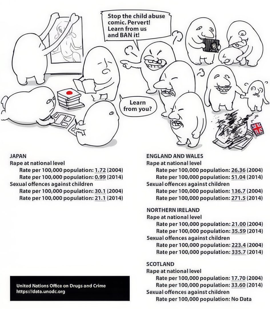 Meanwhile, crime statistics paint a starkly different picture: with a violent crime rate of just 1.3 per 100,000 in 2022 (per UNODC data), Japan remains one of the safest countries for women and children, far outpacing the U.S. (41.5) and England/Wales (117.3) while Interpol’s research report on child pornography shows that Asians as a race have the least amount of child pornography-related crimes.