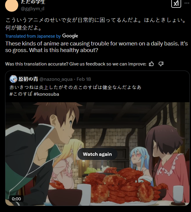 The same individual who decried the KonoSuba anime, merely depicting characters sharing a meal as an example of ingrained sexism that allegedly harms women on a daily basis, also dismissed it as “gross.” Such assertions appear to be more indicative of personal grievances than objective analysis grounded in reality.