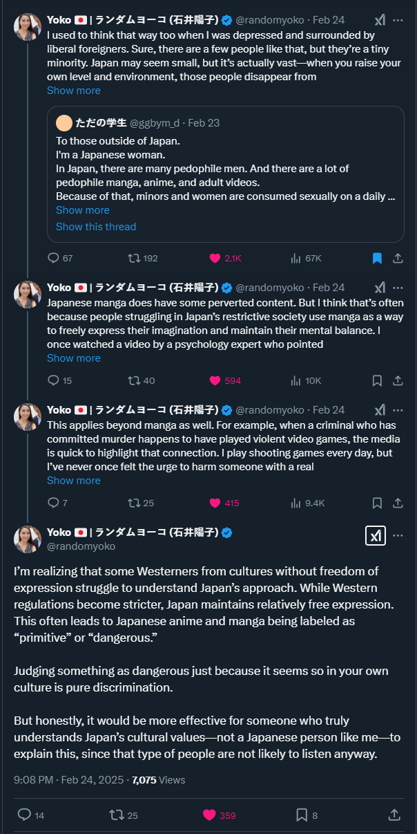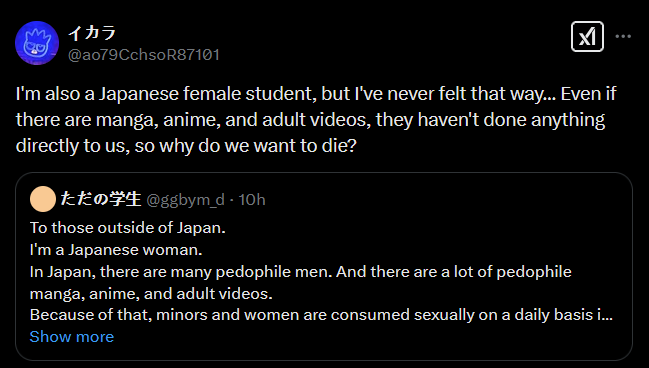 However, the comic she cited was later identified as a doujinshi sold on DLSite, a fictional, legal work entirely unrelated to real-world criminal activity. Her claims that Japan is a major producer of “pedophilic” anime, manga, and adult films, and that women and minors are “sexually consumed on a daily basis,” contributed to an exaggerated narrative of widespread exploitation within Japan.
