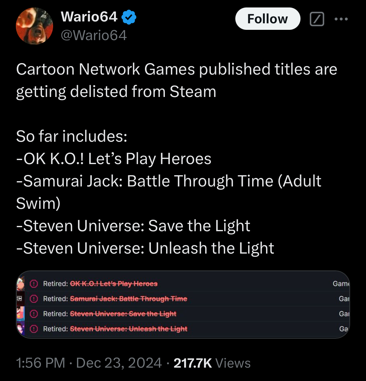 Despite the wave of delistings, a small handful of Cartoon Network titles remain available, for now. Monsters Ate My Birthday Cake and Cartoon Network Journeys VR are still on Steam as of December 26. The DLC soundtrack for OK K.O.! Let’s Play Heroes is also still up, and Samurai Jack: Battle Through Time remains purchasable on the Epic Games Store.