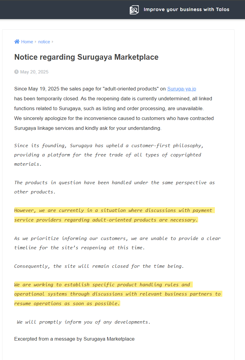 Surugaya initially cited “system maintenance” as the reason for the suspension, noting that certain products were temporarily unavailable. However, in a subsequent statement released through Talos Systems, its e-commerce partner, the company acknowledged that “a situation has arisen that requires discussions with providers regarding payment methods for adult products,” effectively confirming that their wide catalog of mature items will remain off their digital shelves for now.
